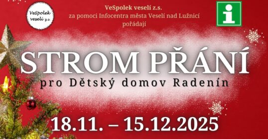 18. 11. – 15. 12. 2025 Pojďme společně vykouzlit krásné Vánoce dětem z Dětského domova Radenín 💛 Na Stromě přání si můžete vybrat konkrétní dětské přání, splnit jej a zabalený, pojmenovaný dárek doručit do Infocentra ve Veselí nad Lužnicí.📍 Místo odevzdání:Infocentrum města Veselí nad Lužnicí, náměstí T. G. Masaryka 26…